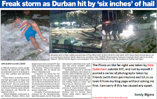 The Saturday Independent (www.iol.co.za) saw my link on twitter, accessed my blog and took a photograph from there, without my consent, publishing it on the front page of the Saturday paper. I was given credit for taking the picture. If I had been contacted and asked for permission, I would have sent them directly to Kate and she would have had credit for the image taken.